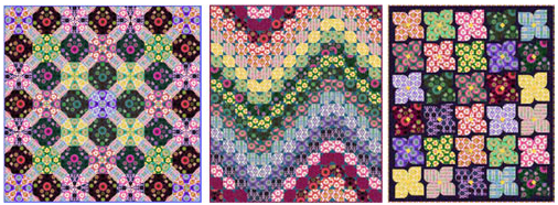 The arrangement and repeat of the flowers make them perfect for kaleidoscope quilts, as shown in the quilt below on the left.