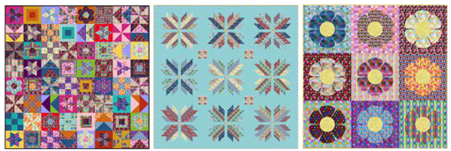 Eighteen fabrics replicate six, small scale patchwork blocks in beautiful colours that range from cloudlike to jewel toned. Now in stock.