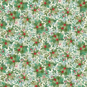 Good Tidings Christmas fabrics by Makower. Traditional Christmas fabric range from Makower with classic icons such as holly, ivy, mistletoe and snow flakes. Fabric colour palette of warm reds, deep greens and ivory. Fabrics by the metre, as well as panels, charm pack and fat quarter bundle