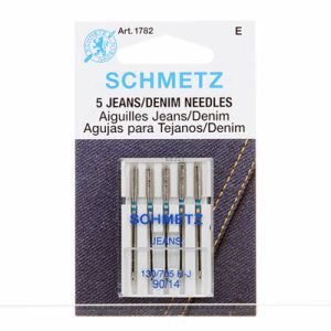 Schmetz Denim needles have a modified medium ball point and reinforced blade. For denim and similar fabrics. For penetrating extra thick woven fabrics denims or quilts with minimum needle deflection reduced risk of needle breakage and skipped stitches.