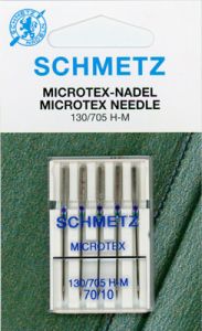 Microtex needles from Schmetz feature a slim, acute point, useful for accurate stitches on cotton, densely woven and coated materials. It creates an exact seam appearance with straight stitches and helps to reduce seam puckering. point for straight stitches on delicate and microfiber fabrics
