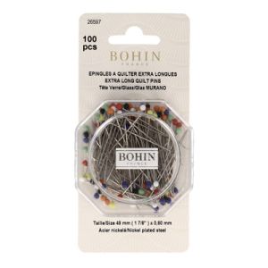 A selection of glass headed pins. The glass head helps to prevent melting if ironed over whilst in the fabric. The different colours of the pin head help to see the pin while it is in the fabric or on the floor!