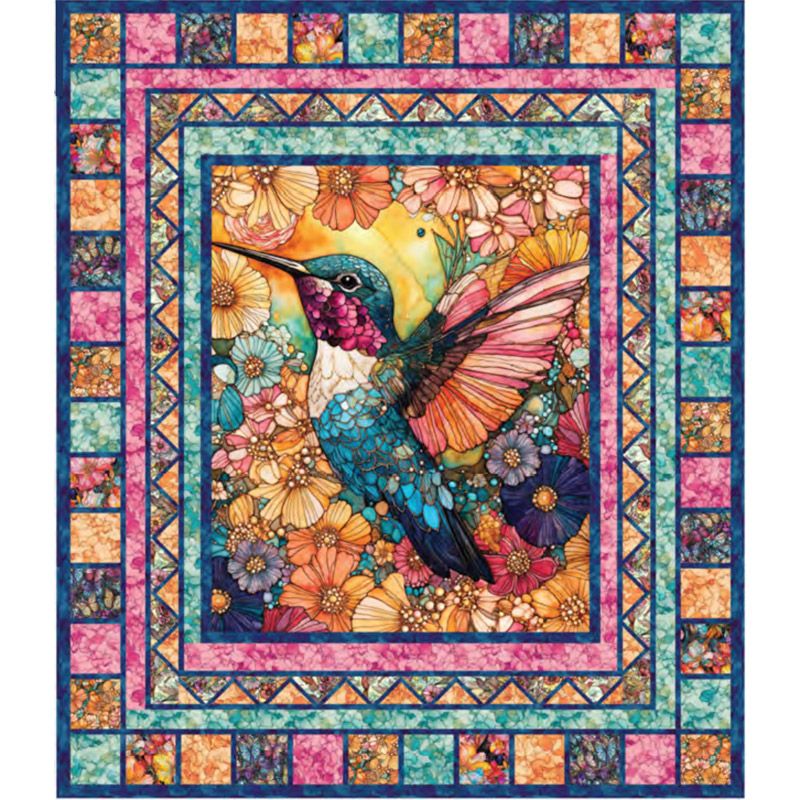 Humming Beauty Quilt Kit designed by The Whimsical Workshop using the Flights of Beauty fabric range by Camelot Fabrics and Peggy Collins. It includes fabric for quilt top and binding and the pattern. The centre is a panel measuring 36" x 43-1/2".