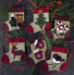 The Ornaments kits provide all fabrics for each ornament plus embellishments: buttons, beads, and embroidery floss (as needed) and step-by-step instructions.