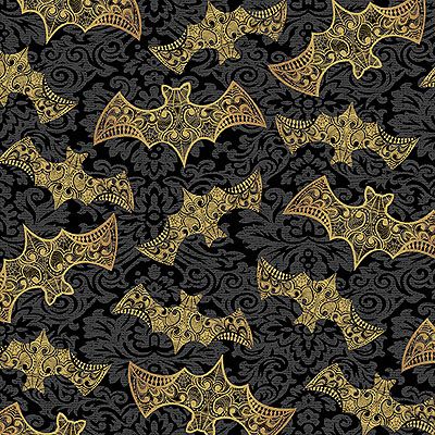 Mystery Manor Halloween fabric: Gold Bats Black (per 1/4 metre)