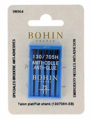 Bohin anti‐glue machine needles have been designed to ease your sewing work. They have a special embroidery point and their flat shank guarantee a precise placement of the needle. The very specific anti‐adhesion coating gives them a perfect glide through all type of glued supports with adhesive sprays, textile glue, hook and loop closeures, fleece… etc. This coating will reduce considerably stocky glue bits in the needle groove and eye after sewing.