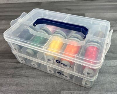 Hemline portable thread organsier can be expanded with additional trays to make it stackable. Extra image shows Essential Neutrals and Essential Colours together.