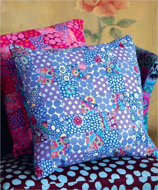 The design for this cushion is so simple ‐ a series of square blocks in five toning fabrics ‐ but it is great fun to make!