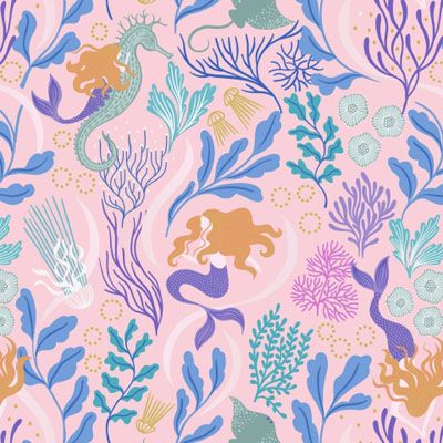 Moontide fabric: Mermaids on Pink with Gold Metallic Lewis and Irene
