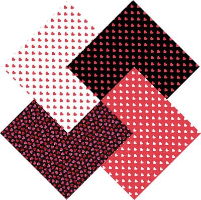 A selection of 4 fabrics with heart prints in classic red, white and black colours cut to fat quarters. Each fat quarter measures approximately 50cm x 55cm.
