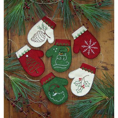 A collection of six mittens, each with a lovely embroidered design to celebrate the holidays! Mittens open at the top and can be filled with small gifts or sweets. Design motifs include a plump snowman, jaunty Santa, stately pine tree, pine cone, holly sprig, and delicate snowflake. Suitable for trimming the tree, decorating packages, and gift giving. Ornaments are approx. 4 1/4" high.