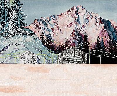 'Homestead’ depicts a scene of an abstract homestead nestled in a pine forest overlooking a distant mountain range. The piece combines multiple viewpoints and stylistic interpretations of the pine forests endemic to the reference area in Alaska, creating the foreground to the mountain subject.