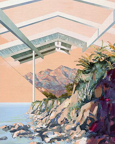 'Shaman' means medicine man or woman in ancient cultures. They often used medicinal herbs and remedies as healing agents. Here, the title reflects the power of the flora in hilly regions like that featured here ‐ the Santa Ynez mountains and bluffs of Santa Barbara, California. They provide the structural substrate necessary for geological stability. When foliage is lost after wildfires, like those common in this area due to climate change‐induced droughts, landslides and erosion of the topsoil can occur. The large structural feature at the top of the painting is symbolic of both the midcentury‐modern California Rancho architecture of the area, and of the plant‐enabled structure critical for stability in these biomes.