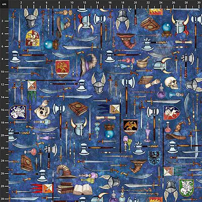 Dragon Quest fabric: Weapons and Shields Blue (per 1/4 metre)