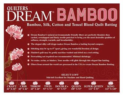 Quilters Dream Bamboo Batting is a luxurious blend of velvety Bamboo, luscious silk, strong silky Tencel® and soft stable Cotton. Dream Orient's natural environmentally friendly fibers are carded, crosslapped and finely needlepunched to bring you the most desirable qualities of softness, strength, warmth and breathability. The elegant silky soft drape makes Dream Orient a batting beyond compare!