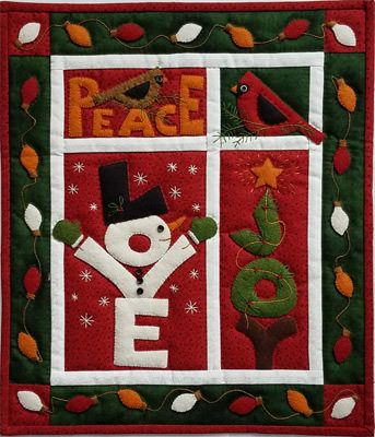 Sentiments of the season come together in this happy Christmas wall quilt. An exuberant snowman declares LOVE. A pine tree wrapped in delicate garland radiates JOY, and a pair of birds nestles around PEACE. All are surrounded by strings of colourful fairy lights. Finished size is 13” x 15”.