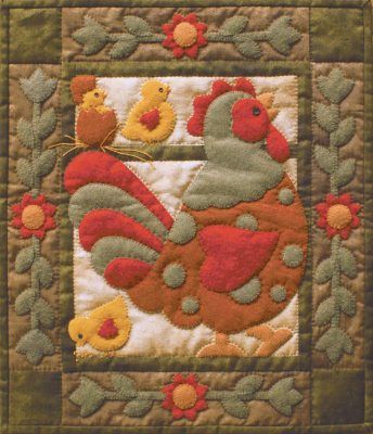 Kit includes all woolfelt for applique, all fabrics (100% cotton) for background, borders, back, and binding, batting, buttons for eyes, embroidery floss, precise patterns and complete illustrated instructions. Colors are rust, green, red, gold, brown, and beige.