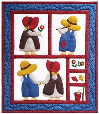 Shy and sweet, Sue & Sam have been favourites of quilters for many years. In this variation, Sue picks flowers and Sam catches fish. At the end of the day, they share a moment holding hands. Finished size is 13” x 15”.