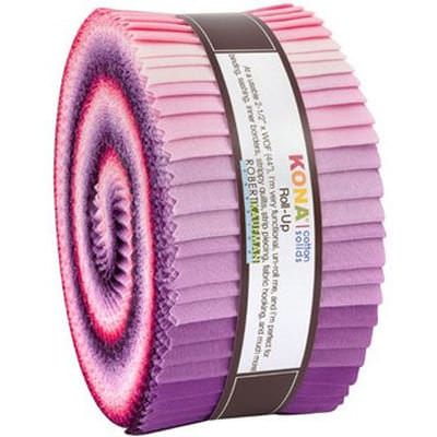 A selection of 40 complementary pink and purple tones from the fabulous palette of Kona cotton fabrics. Fabrics are cut to approximately 2‐1/2" by the fabric width (approximately 42"/110cm).