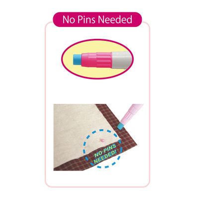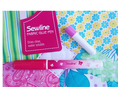 Just run the glue pen along the fabric edge, hold the pieces together and you have a temporary bond. Goes on coloured, dries clear. Washes out and will not gum up your needle.