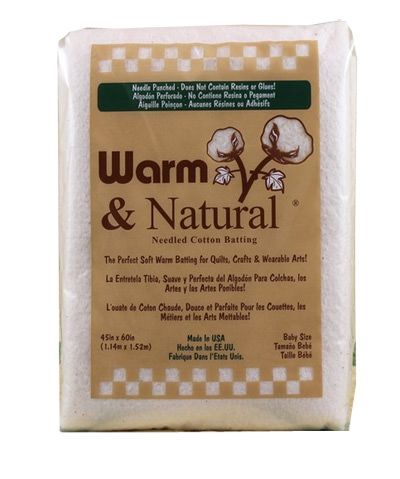 Warm & Natural is the finest needle‐punched cotton wadding! Only 15% of all cotton grown in the USA is the proper length, thickness and color. Out of this 15%, only 5% is clean enough for Warm & Natural! This soft, natural cotton has never been washed or bleached with harsh chemicals. It's kinder to the environment and kinder to your batting. The cotton undergoes a mechanical cleaning process removing all of the seeds, seed coats, along with the majority of leaf and stem remnants. The remaining tiny plant particles lend a special look to crafts like no other and won't harm your quilt.