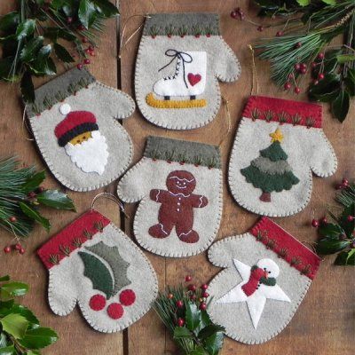 Kit includes woolfelt, embroidery floss, gold string plus precise patterns and illustrated instructions to make 6 mittens. Colors are sandstone, red, green, gold, brown, and white.
