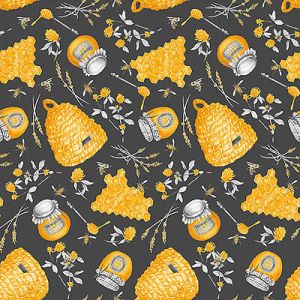 Show Me The Honey Fabric: Beehives & Honey Jars Grey (per 1/4 metre) |