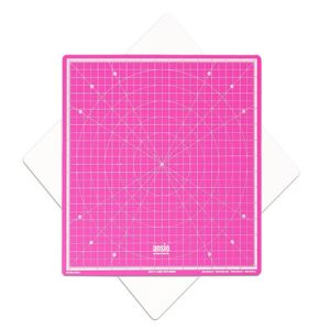 Our Rotating rotary cutting mats feature two pieces. Firstly there is the top rotary cutting mat which is similar in design to a normal rotary cutting mat. Secondly underneath is a turntable which allows the mat to rotate which can be very useful when you are cutting out many smaller patchwork pieces. For example if you were cutting out triangles using the Marti Michell templates with the double blunt corners then you can rotate the rotary mat meaning you are always in the correct position.